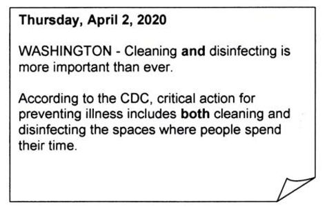Fourth, always follow the label use directions for enveloped viruses, which is the category that COVID-19 falls under. Disinfectants can have up to a 10 minute contact time, which means that the disinfectant needs to be left wet on the surface for 10 minutes in order to kill the targeted types of germs.